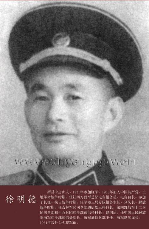 徐明德少将,新县人。曾任中国人民解放军海军司令部通信处处长,海军通信兵部主任,海军副参谋长。