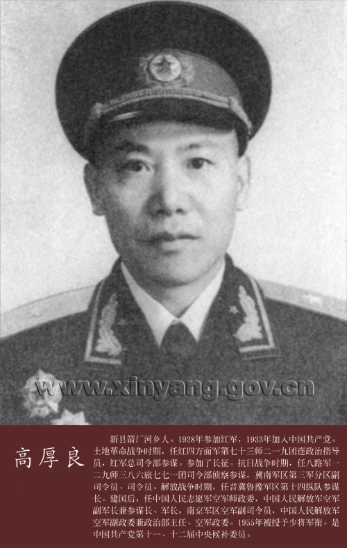 高厚良少将,新县人。曾任中国人民志愿军空军师政委,中国人民解放军空军副军长兼参谋长、军长,南京军区空军副司令员,中国人民解放军空军副政委兼政治部主任、空军政委。
