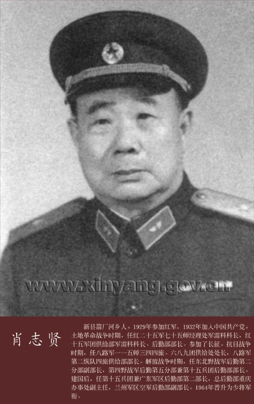肖志贤少将,新县人。曾任第15兵团兼广东军区后勤部第二部长,总后勤部重庆办事处副主任,兰州军区空军后勤部副部长。