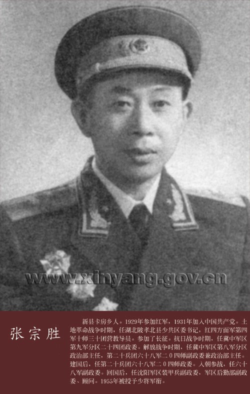 张宗胜少将,新县人。曾任第二十兵团六十八军二0四师政委。入朝参战,任六十八军副政委。回国后,任沈阳军区装甲兵副政委,军区后勤部副政委、顾问。