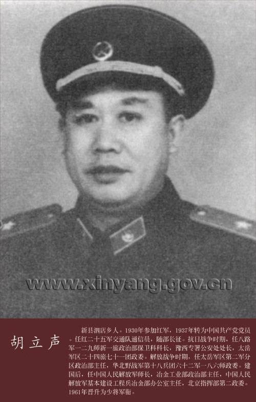胡立声少将,新县人。曾任中国人民解放军师长,冶金工业部政治部主任,中国人民解放军基本建设工程兵政治部办公室主任、北京指挥部第二政委。
