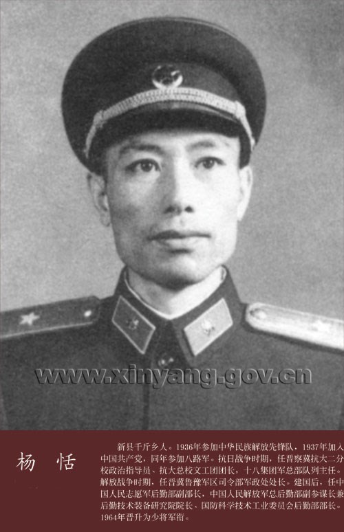杨恬少将,新县人。曾任中国人民志愿军后勤部副部长,中国人民解放军总后勤部副参谋长兼后勤技术装备研究院院长,国防科学技术工业委员会后勤部部长。