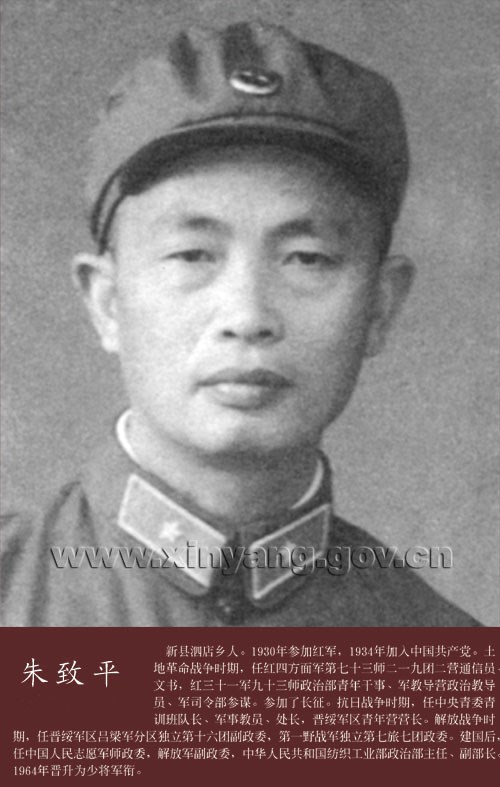 朱致平少将,新县人。曾任中国人民志愿军师政委、军副政委,机械纺织工业部政治部主任、副部长。